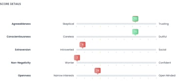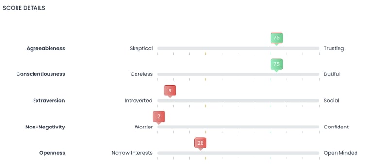 Openness tells you how curious an individual is, if they are willing to try new things and if they are a creative thinker. Low scores indicate conventional behaviour, a conservative outlook and a preference for the familiar.
