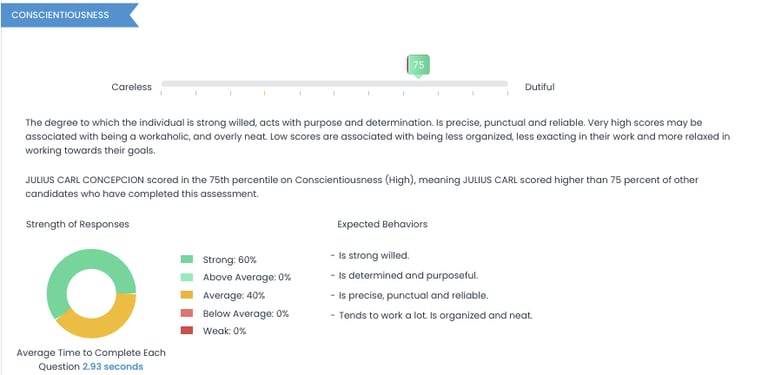Assess the extent to which a person shows strong determination and displays precision, punctuality, and reliability. Low scores are associated with being less organized, less exacting in their work and more relaxed in working towards their goals.